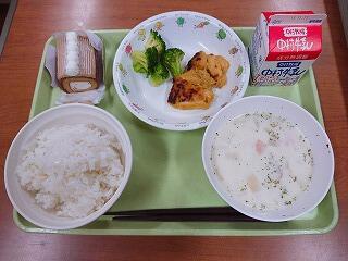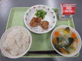 麦ごはん とうきび汁 鶏の唐揚げ 添えきゅうり