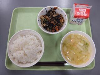麦ごはん 大豆とひじきの炒め煮 石狩汁