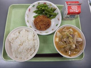 麦ごはん キムチ汁 宮崎黒豚メンチカツ 枝豆