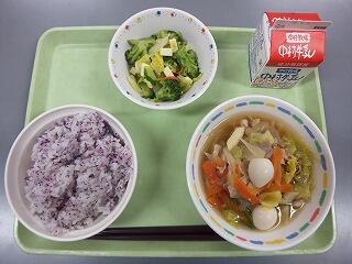 麦ごはん 五目スープ 鶏の唐揚げ 添えブロッコリー