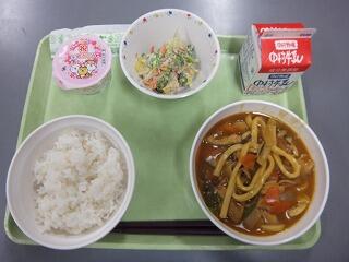 減量麦ごはん カレーうどん ごまネーズ和え お祝いいちごゼリー