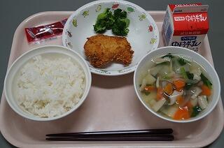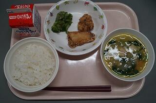 麦ごはん 卵ときのこのスープ 魚のマヨネーズ焼き 枝豆