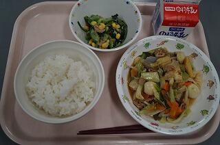 麦ごはん 八宝菜 ほうれん草のサラダ