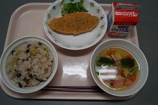 麦ごはん コーンスープ 鶏の唐揚げ ゆかりあえ