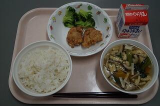 麦ごはん きのこ汁 鶏の唐揚げ 添えブロッコリー