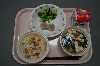 麦ごはん きのこ汁 鶏の唐揚げ 添えブロッコリー