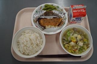 麦ごはん 鶏ごぼう汁 魚のごまみそ焼き 枝豆