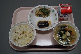 麦ごはん 鶏ごぼう汁 シイラの甘辛揚げ おかか和え