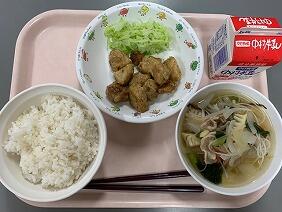 麦ごはん フカのレモン揚げ 添えキャベツ ケールスープ