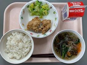 麦ごはん 添え野菜 鶏のから揚げ 五目スープ