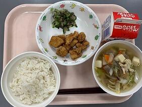 麦ごはん 白身魚の甘辛揚げ ゆかり和え 鶏ごぼう汁