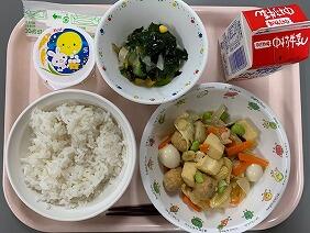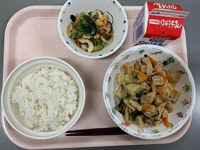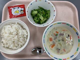 ハヤシライスには細切りの玉ねぎやニンジンがたっぷり入っており、ルーと一緒に野菜の食感も楽しむことができました。やっぱり、ハヤシライスのときはいつもよりご飯を食べる量が増えているようです。花野菜のマヨネーズ和えは、コクがあってハムの塩気も効いていておいしかったです。