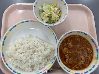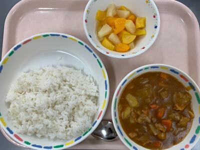 今日はみんなの大好きなポークカレーです。甘めの味付けで、ジャガイモや豚肉もたっぷり入っていて食べ応えがありました。保育所生も児童も、いつもよりご飯を多めに食べました。(何人かは顔や服にカレーをつけていました。)フルーツは甘くて冷たくて、とってもおいしかったです。