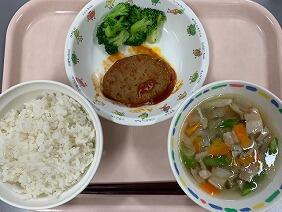 麦ごはん 添えブロッコリー ケチャップハンバーグ オニオンスープ
