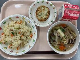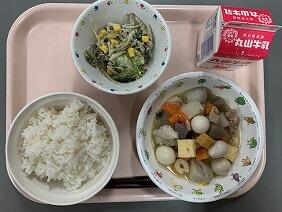 今日は、給食感謝献立でした。明治22年に山形県で始まった無料のお昼ご飯をモチーフに、当時を再現しています。小松菜のたくあん炒めは、ポリポリしていて、たくあんの塩気で小松菜も食べやすかったです。鮭は少し固めで食べ応えがあり、塩味がごはんとよく合います。栄養すいとんは、みそ味でほっこりとあたたかく、すいとんもモチモチしていておいしかったです。毎日おいしい給食が食べられることに感謝です。
