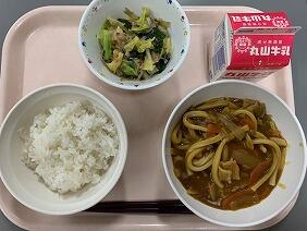 海藻サラダは、大根とキャベツがシャキシャキしていて、海藻独特の食感とよく合っていました。さっぱりとした味付けで子どもでも食べやすく、とてもおいしかったです。カレーうどんはやっぱり大人気のメニューです。うどんを食べた後、ご飯と一緒に食べて二度おいしい子どもたちでした。