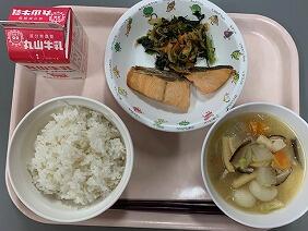 麦ごはん 鮭塩焼き 小松菜のたくあん炒め 栄養すいとん