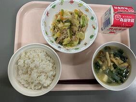 今日は入学式でした。準備から本番、片付けまでがんばった子どもたちは、くたくたで腹ペコです。豚肉としょうがの香りが食欲をそそります。しょうが炒めには野菜がたっぷり入っていて食べ応えがあり、子どもたちもパクパク食べていました。なめこ汁はとろみがついていて、最後まで温かく食べられました。明日は新1年生の初めての給食です。いまからカレーが楽しみです。