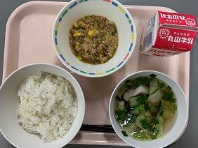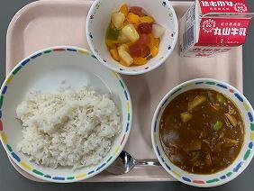 今日は新1年生の初めての給食です。チキンカレーはコクがあり、じゃがいもが大きく食べ応えがありました。ごはんにかけてあっという間にたいらげました。フルーツミックスは甘くて、デザートにピッタリでした。1・2年生の教室では、「おいしいね」と言いながらみんな笑顔で給食を楽しんでいました。