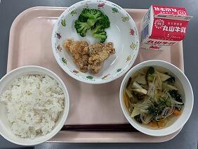 麦ごはん 鶏の唐揚げ 添えブロッコリー 五目スープ