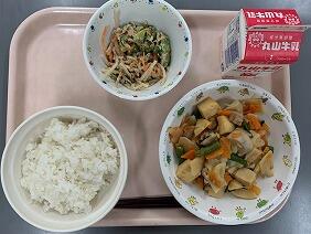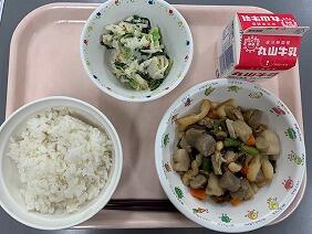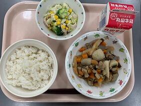 花野菜のマヨネーズ和えは、ブロッコリーの緑とハムのピンク、コーンの黄色が鮮やかで、見た目にも楽しめました。鶏肉のうま煮は良く煮こまれていて、スライス天ぷらのうま味が他の具材によく染みていました。優しい和風の醤油味で、ご飯によく合いました。今日は、3年ぶりに全員で給食を食べました。(職員も初めての経験です。)いつもと雰囲気が違ってドキドキしましたが、みんな楽しそうに食べていました。