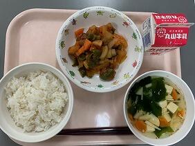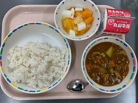 カレーにはスパイスだけでなく、しょうがやニンニクも効いていて、元気が出ました。おいしいルーのおかげでご飯がいつもより進みます。フルーツ杏仁は甘くて、杏仁豆腐のような味でした。冷たくてフルーツもおいしく、みんな笑顔で食べていました。