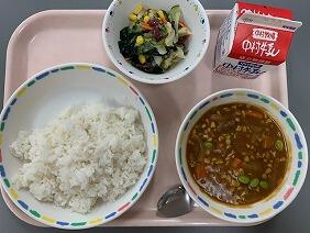 今日はポークカレーでした。ひきわり大豆と枝豆がたっぷり入っていて、食べ応えがありました。今日のような暑い日でも、カレーなら食欲がわくようで、子どもたちもあという間に食べ終えてしまっていました。海藻サラダはさっぱりした味付けで、パクパク食べられました。