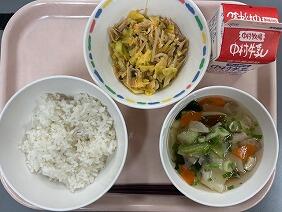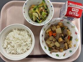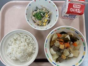 今日は給食感謝メニューでした。給食感謝週間と合わせて、昔ながらの献立を味わいます。小松菜のたくあん炒めは、たくあんと小松菜の食感がよく、少しの量で食べごたえがありました。栄養すいとんには、煮込みもちが入っています。具だくさんのお雑煮のようで、みそ味で体が温まりました。