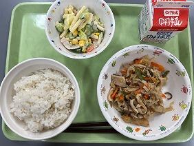 ごまじゃこサラダにはじゃこがたっぷり入っていて、苦みと食感が良いアクセントになっていました。にんにくの風味も良く、食欲をそそりました。豚肉と大根の煮物は、黒糖で煮てあったのでコクがあり、ごはんに合う甘めの味付けでした。今日は給食感謝集会2日目ということで、調理員さんも一緒に食べました。子どもたちも笑顔で話がはずみ、楽しい給食時間になりました。
