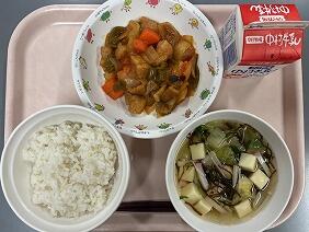 酢豚は、にんにくが効いていてパンチがありました。豚肉がゴロっとしていて、人参も柔らかく、食べ応えがありました。もずくスープはとろみがあり、具材とスープが良く絡んでいて食べやすかったです。ALTの先生は最初は「What is もずく?」と不思議そうでしたが、実際食べてみると「おいしい!」と嬉しそうでした。