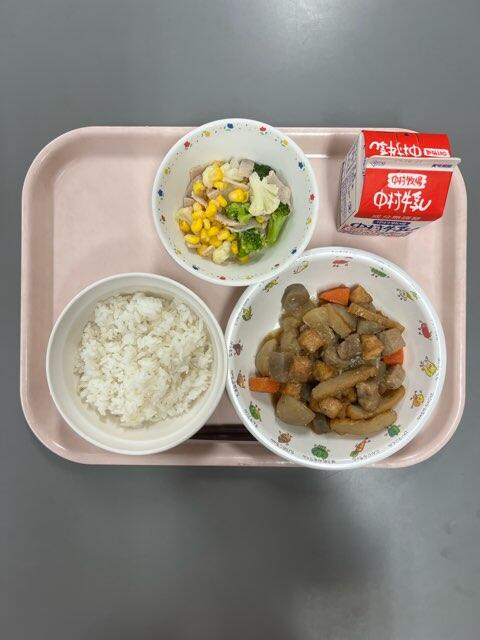 きのこカレーにはくだいた大豆も入っていました。さらに栄養のバランスが良くなっています。ぞして今日はデザートがついています!給食大好き!!