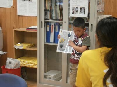 最後に読み聞かせ。2年生のTくんが「おにぎりにんじゃ」を読みました。
