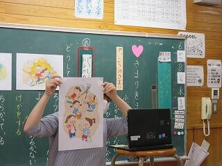 インターネットを使って松尾小との合同学習を行いました。今回は、大河内小の1・2年生の先生が授業を進めます。
