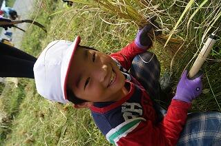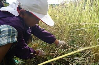 6年生は慣れた手つきで、1年生はやや緊張の面持ちで、刈ります。