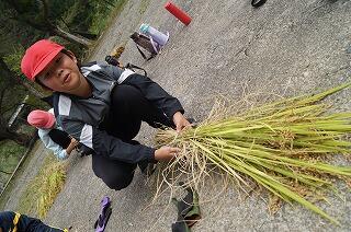 自分で刈った稲を自分で束ねます。「力がいるから大変なんですよ!写してないで手伝ってくださいよ!」。がんばれ~!
