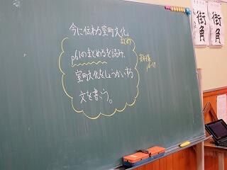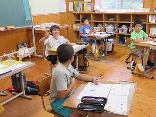 ある日の5・6年生の社会科のお勉強。こちらを向いている6年生2人の課題は「室町文化をしょうかいする文を書こう。」