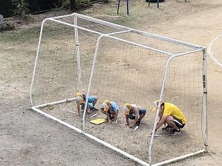 今回もおそろいの帽子をかぶって、先生と子どもたちが運動場で学習をしていました。