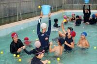 3校時は、雨のため予定していた「カヌー体験」は実施できませんでしたが、ビニルハウス内に設置されたプールで「水中運動会」を行いました。