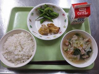 麦ごはん ・ 鶏肉のバーベキューソース ・ 枝豆 ・ 野菜スープ