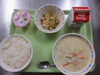 麦ごはん ・ 秋味シチュー ・ 千切大根のサラダ ・ 十五夜デザート