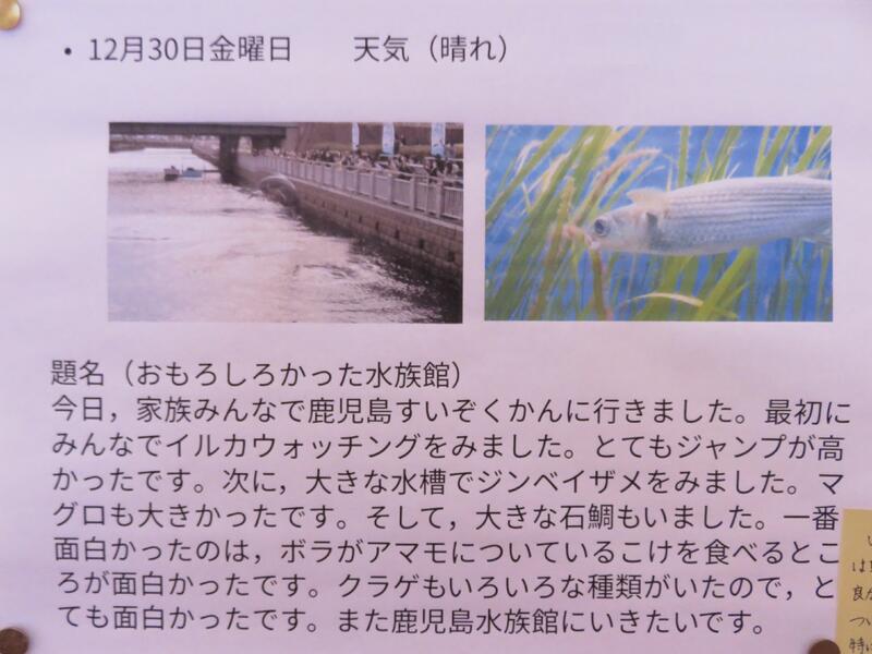 階段掲示板に、冬休みの宿題が貼ってありました。冬休みに取り組んだことを紹介したレポートです。