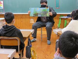 5・6年生には校長先生。子どもたちは神妙な表情です。なぜかというと、校長先生の読み聞かせは「外所(とんところ)地震」の紙しばいだったからです。「外所地震」は、400年ほど前に宮崎市木花の運動公園の辺りで大きな被害を出した地震です。読み聞かせの日は、阪神・淡路大震災のあった日でした。