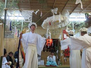猪肉を切り分けて供物を捧げる「板おこし」という演目から始まります。おごそかな空気が流れます。