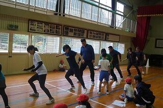 体ほぐしで軽く親子でゲームをしました。お父さんたち、大人げない