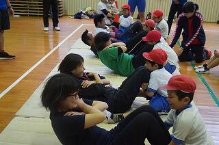 上体起こし。親子で協力、測定。お父さん、お母さん頑張れ。