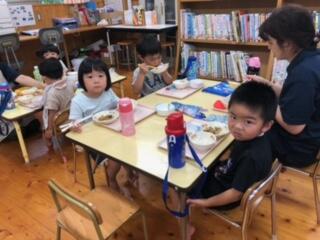 保育所も昨日から再開し、保育所生が給食を食べに来ました。