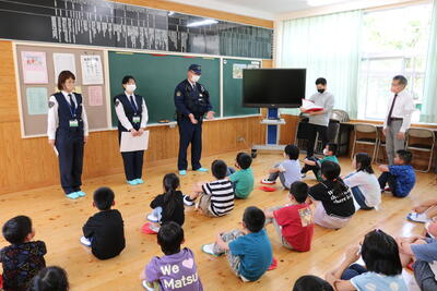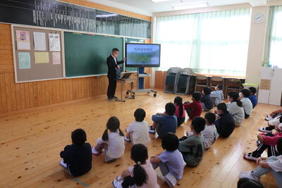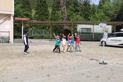 現在、松尾小学校のすぐ横を通る道は、日向市方面から上椎葉に向かうためのう回路になっています。そのため、通常よりは交通量も多く、子ども達も車に気を付け登下校しています。そんななか、4月18日に交通指導員の方、椎葉駐在所長様に来ていただき、交通安全教室を行いました。子ども達は、道路の横断の仕方などを勉強し、貴重な学びの時間になりました。