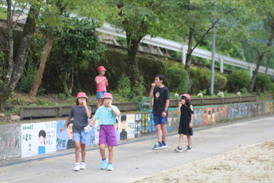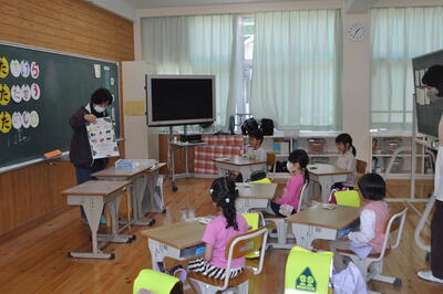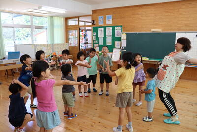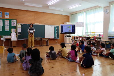 松尾小学校では、低学年と松尾保育所の子どもたちとの交流活動「にこにこランド」を行っています。7月11日、今年、はじめての交流活動を行いました。1年生は、朝から心待ちにしていて、「先生、昨日、いっぱい練習したんですよ!」と興奮気味に話してくれました。小学校で立派なお兄ちゃん、お姉ちゃんになった姿を見せることができたようでした。