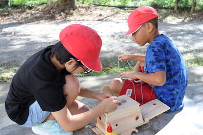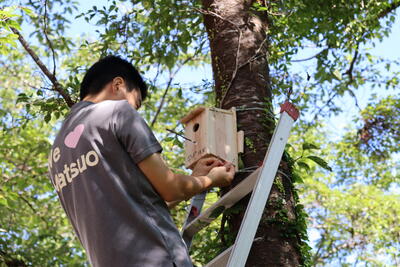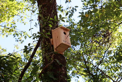 5・6年生が作った鳥の巣箱。鳥が入ってくれるといいな。子どもたちも、より小鳥は入りやすいように工夫し、巣箱を設置していました。
