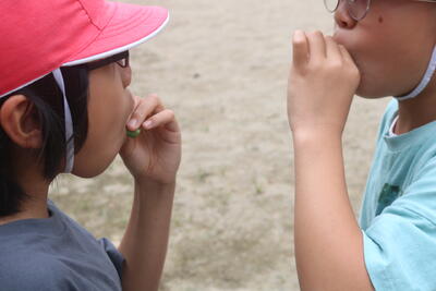 昼休みに、草笛の音が運動場に響きます。